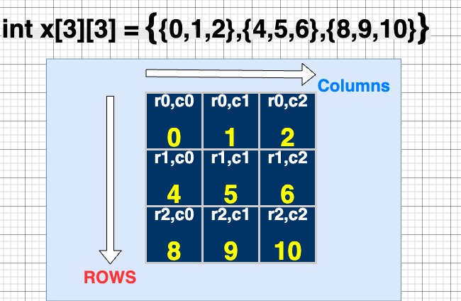 int Arr[3][3] = {0, 1, 2, 4, 5, 6, 8, 9, 10};Method 3: Single Element Assignment